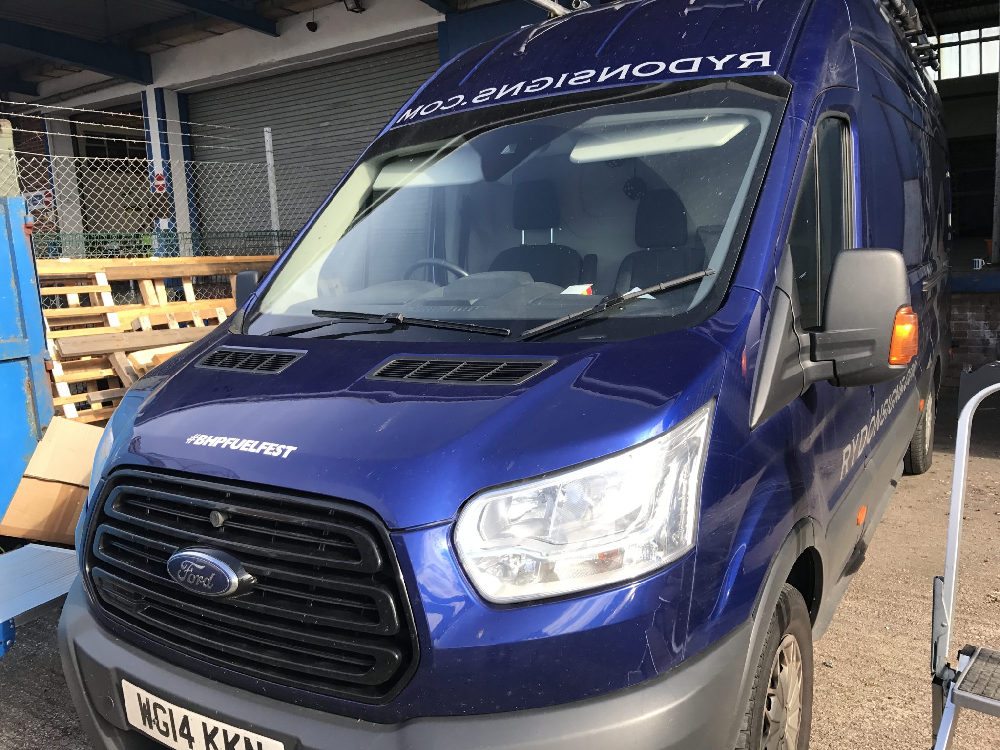 A full size 2014 Ford Transit replacement windscreen in Exeter for Rydon Signs.