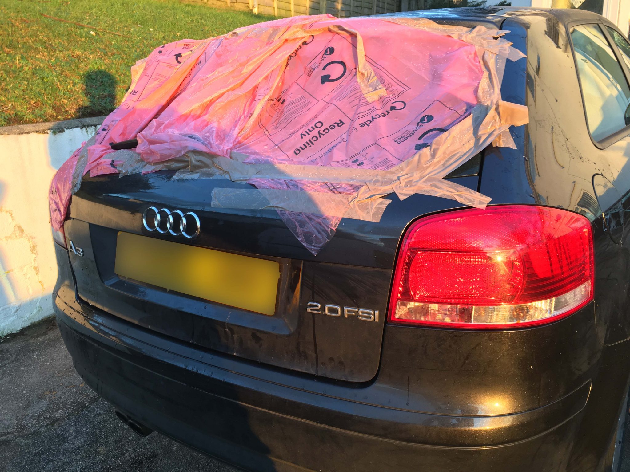 This Audi A3 rear window was smashed in Paignton. This replacement rear window had the standard rear heating element and several additional connectors for the extra antenna such as GPS and usually a radio booster.
