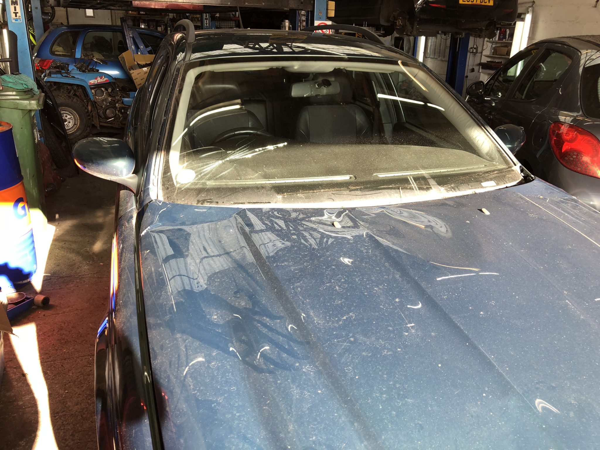 Jaguar X-Type windscreen replacement for a garage in Milber, Newton Abbot. Unfortunately this windscreen was severely damaged after the bonnet flew open whilst the car was moving, the force of the bonnet flying smashed the windscreen on the driver’s side as well as damaging the bonnet.