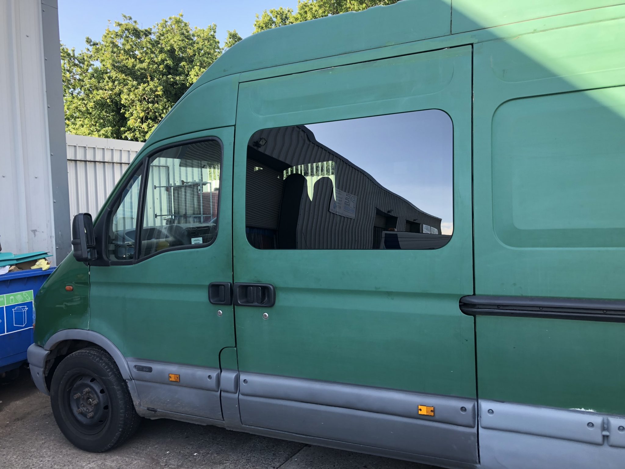 A slightly more complicated conversion as there is no inner body panel to follow on the inside of the van on the driver’s side. We find the best method is to cut the passenger side panel out first and use the removed metal panel as a template for the driver’s side with some careful measuring prior to making the final cut.