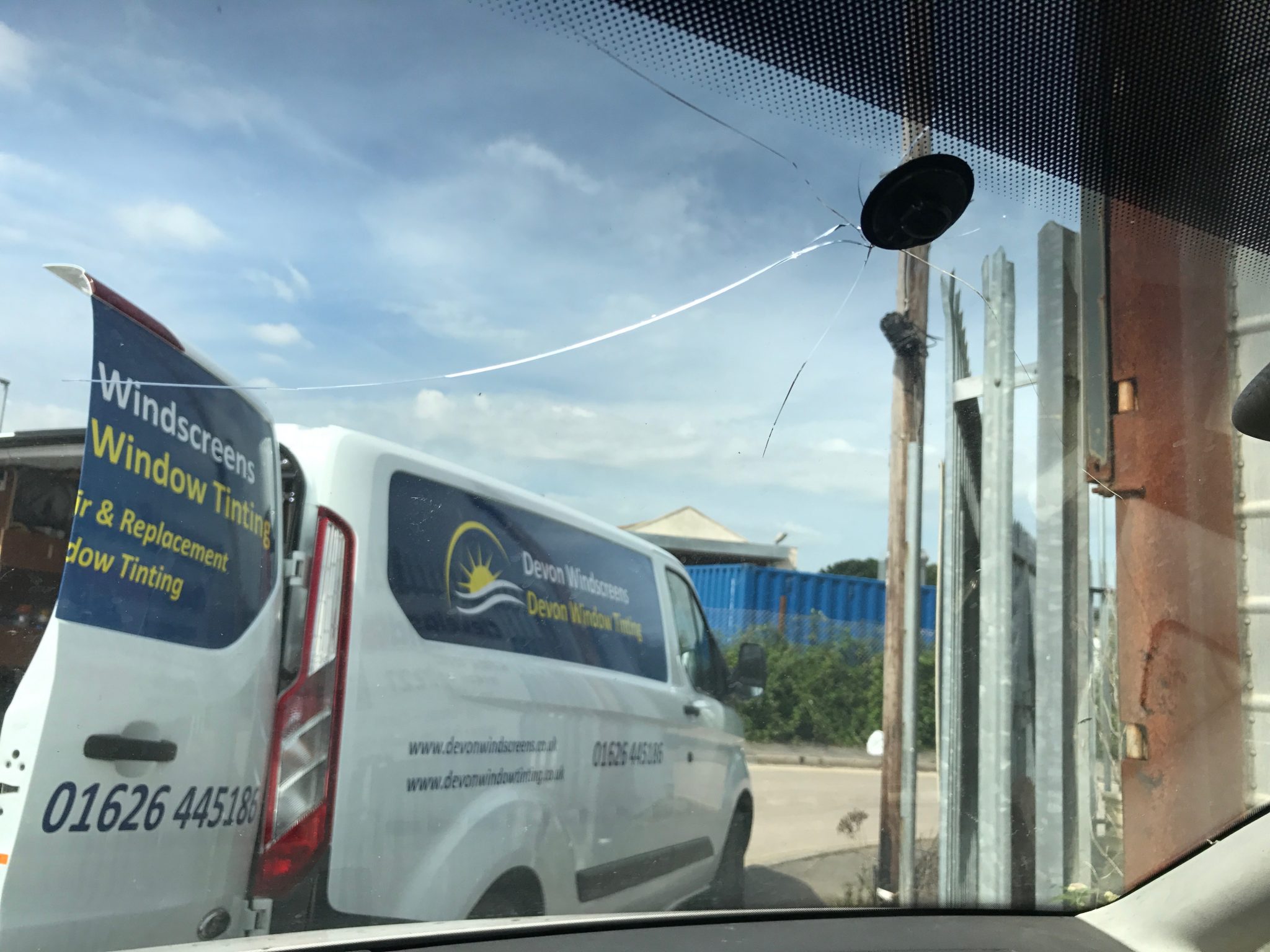 VW Caddy windscreen replacement for a local garage in Dawlish. This screen had cracked after the previous owner had tried to re-attach the interior mirror. Due to the curvature of the windscreen, any pressure applied to the inside of the windscreen when trying to force the mirror back onto the ball joint will result in a broken windscreen.