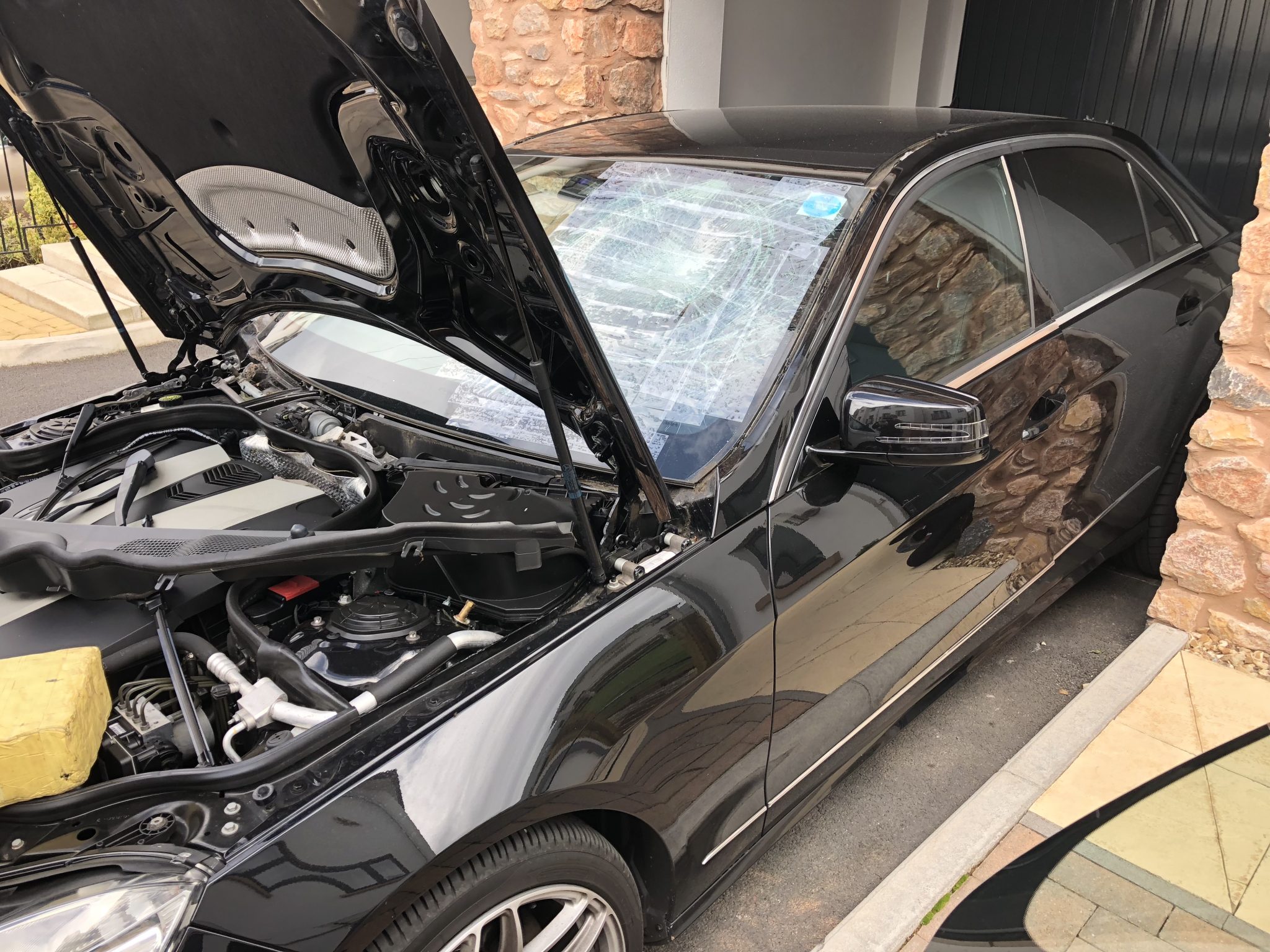 The Mercedes E class windscreen was vandalised in Newton Abbot overnight outside the owner’s house. The windscreen was severely broken on the passenger side and needed an urgent replacement. As you can see from the picture the windscreen was laminated and this means that even with severe damage the glass remains held together by the plastic interlayer reducing the amount of glass fragments entering the car, we always apply a plastic tape over the damaged area prior to removal to prevent any further glass debris entering the car.